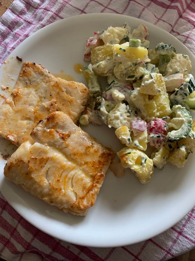 Am Samstag war dann der „große Tag“. Ich habe mir das erste Gericht ausgesucht und dann so zubereitet, wie es auf den Begleitkarten draufsteht. Da ich mich stur an die Vorgaben gehalten habe, war ich auch in der angegeben Zeit fertig. Es gab „Zitroniges Fischfilet“. Es ist mir auch eigentlich gut gelungen.